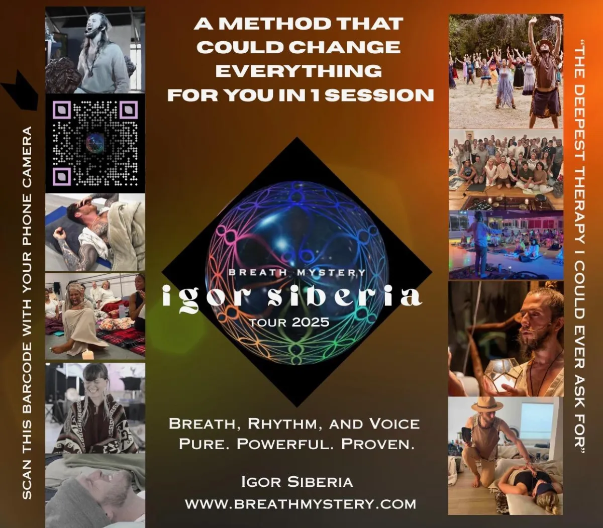 This event is often described as: “The deepest therapy I have ever experienced!”. You’ll be guided by Igor's unique methodology and enriched by his Siberian Native Frequency Instruments & Live Music, this transformative voyage integrates diverse meditative practices, breathwork techniques, various vocal elements, and a rich variety of rhythms, fostering profound healing and personal growth.